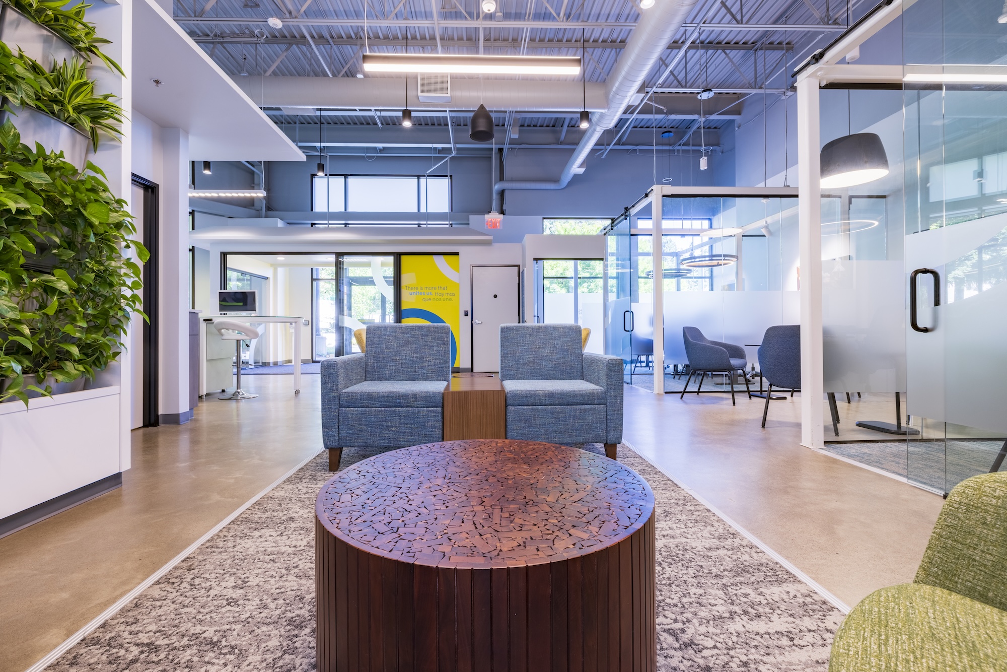 To match their new focus on a choreography based, consultative approach, the floor plan of this branch is designed to be open environment with collaboration areas, green and glass walls, new office doors, touch engagement, and digital signage. This technology, such as the large digital wall, various touch screens, and the unique teller pod approach, helps facilitate and meet transactional needs.